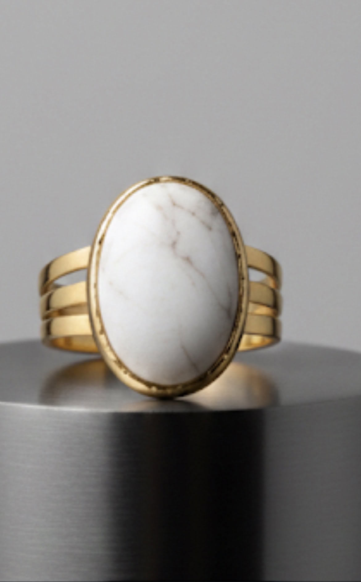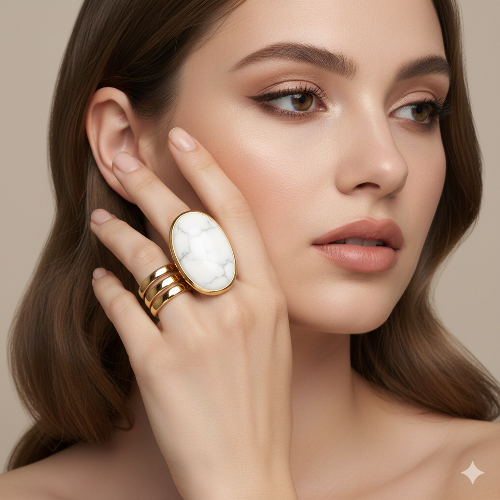 L’anello Nirvana fonde un design audace a tre fasce con la purezza di una pietra ovale marmorea.