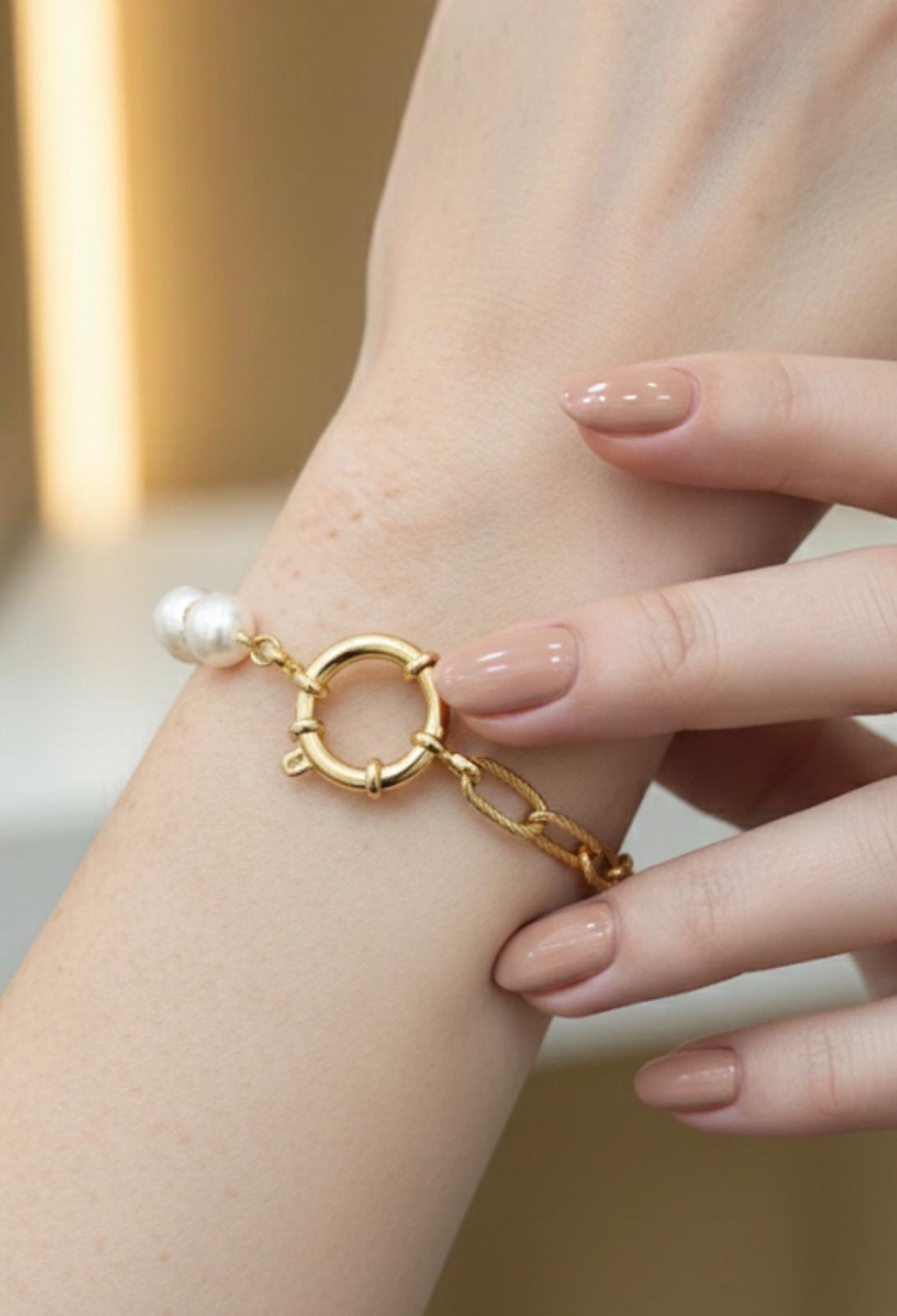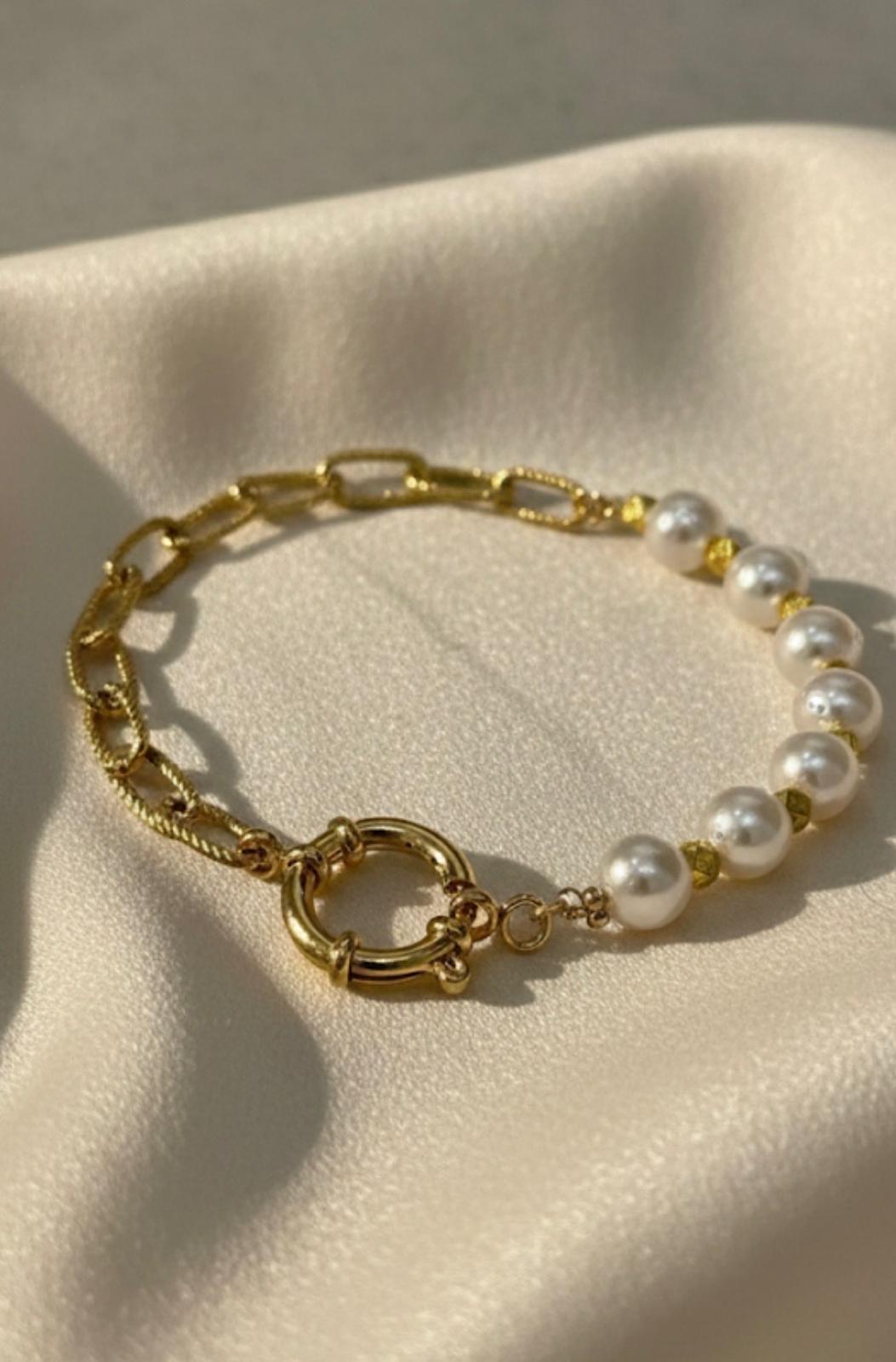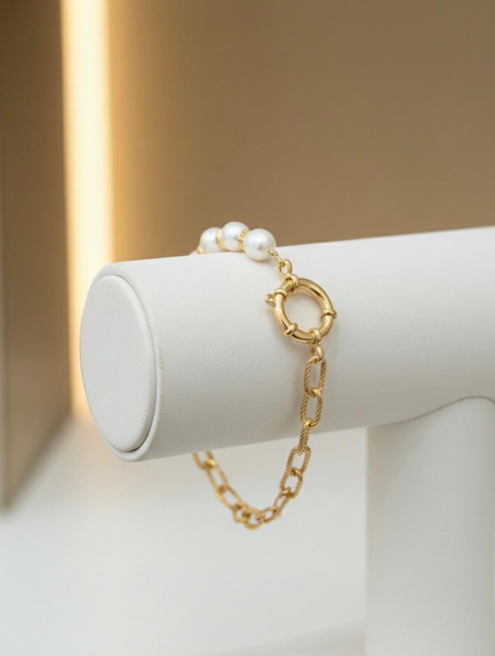 Creato in acciaio inossidabile dorato e arricchito da perle luminose, unisce la forza del design moderno alla delicatezza di uno stile senza tempo. La catena a maglie e la chiusura decorativa donano carattere al bracciale, rendendolo unico e versatile.