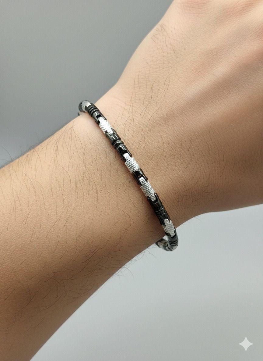 Bracciale in acciaio inossidabile dal design moderno, caratterizzato da dettagli intrecciati bicolore che aggiungono stile e personalità. Resistente, leggero e perfetto per un look quotidiano elegante e contemporaneo.