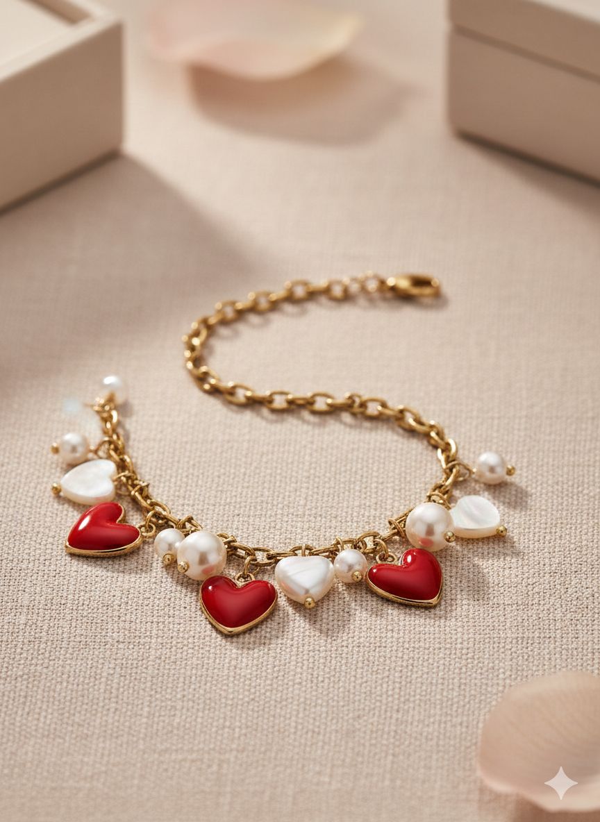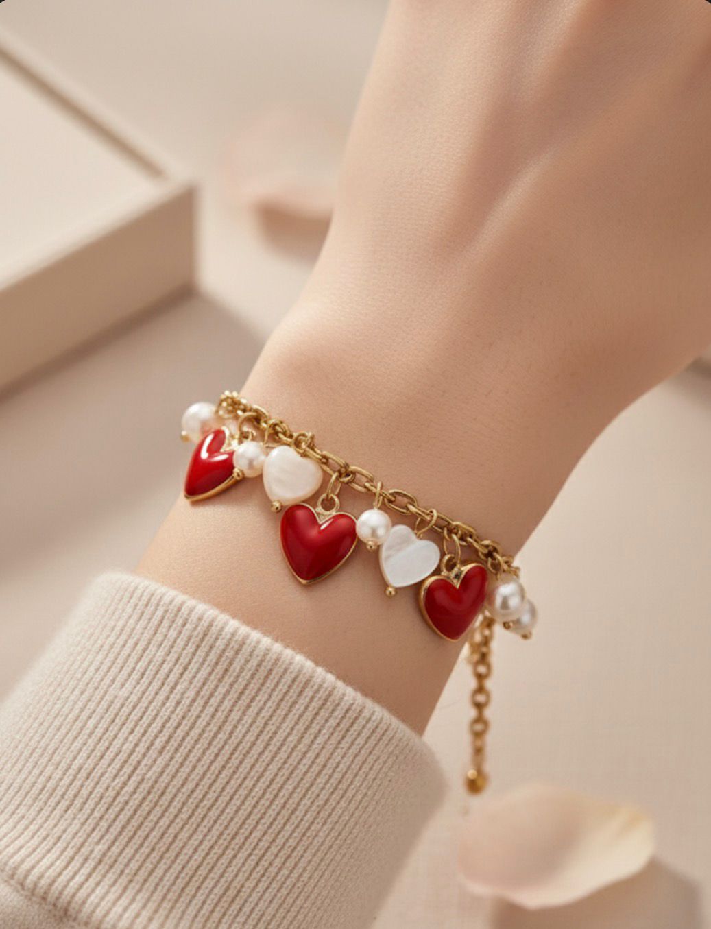 Realizzato in acciaio di alta qualità, resistente e brillante nel tempo, è decorato con raffinati charm a cuore che donano movimento e un tocco romantico al polso.