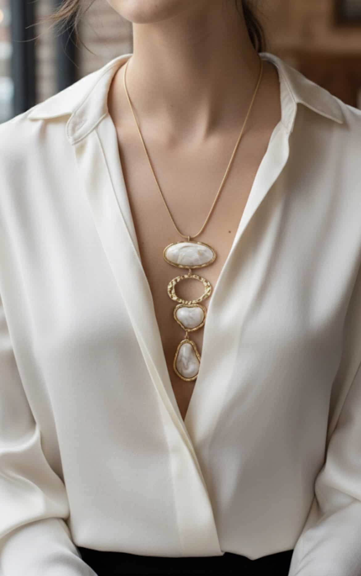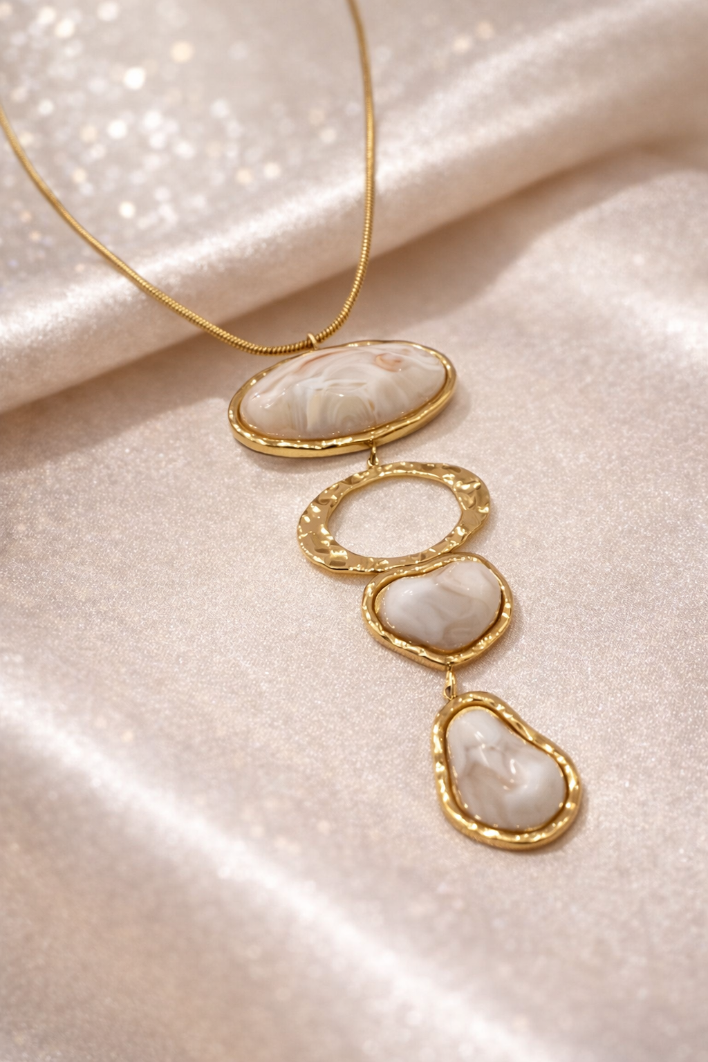 La collana Nirvana è un tributo all’equilibrio e alla bellezza naturale. Caratterizzata da un design a pendente multiplo, questa creazione in acciaio inossidabile gioca con il contrasto tra la lucentezza dell’oro e la purezza delle pietre effetto marmo. I quattro elementi a cascata — che includono un anello con finitura martellata e tre inserti dalle venature organiche — creano un movimento fluido e sofisticato sul decolleté.