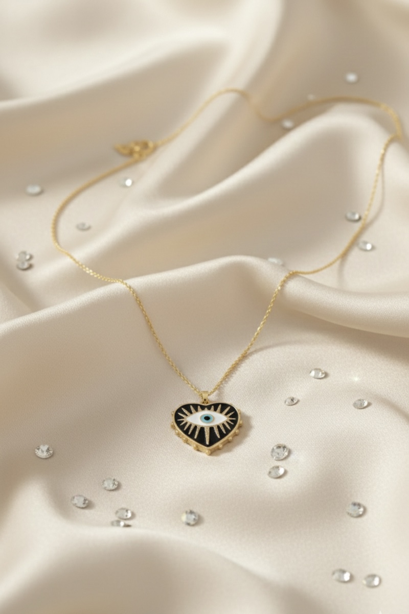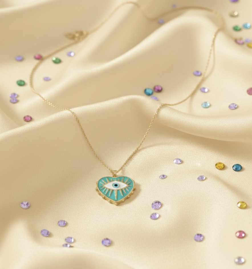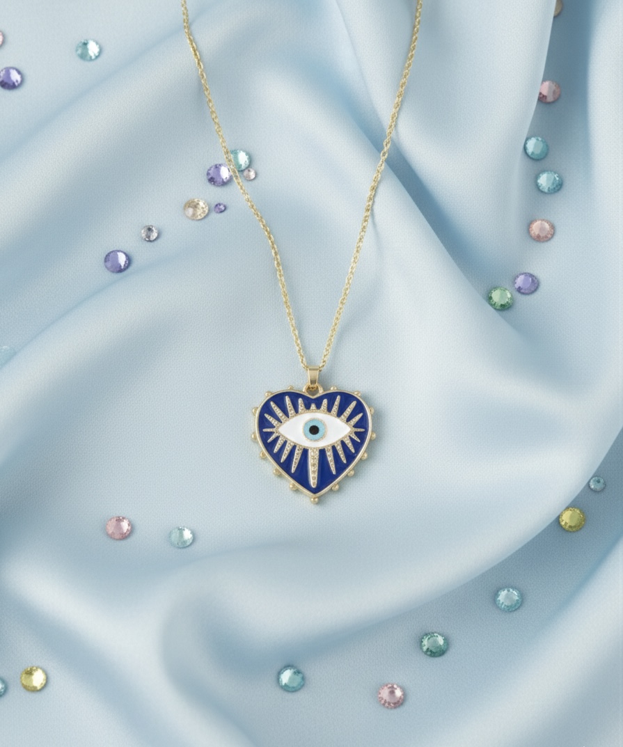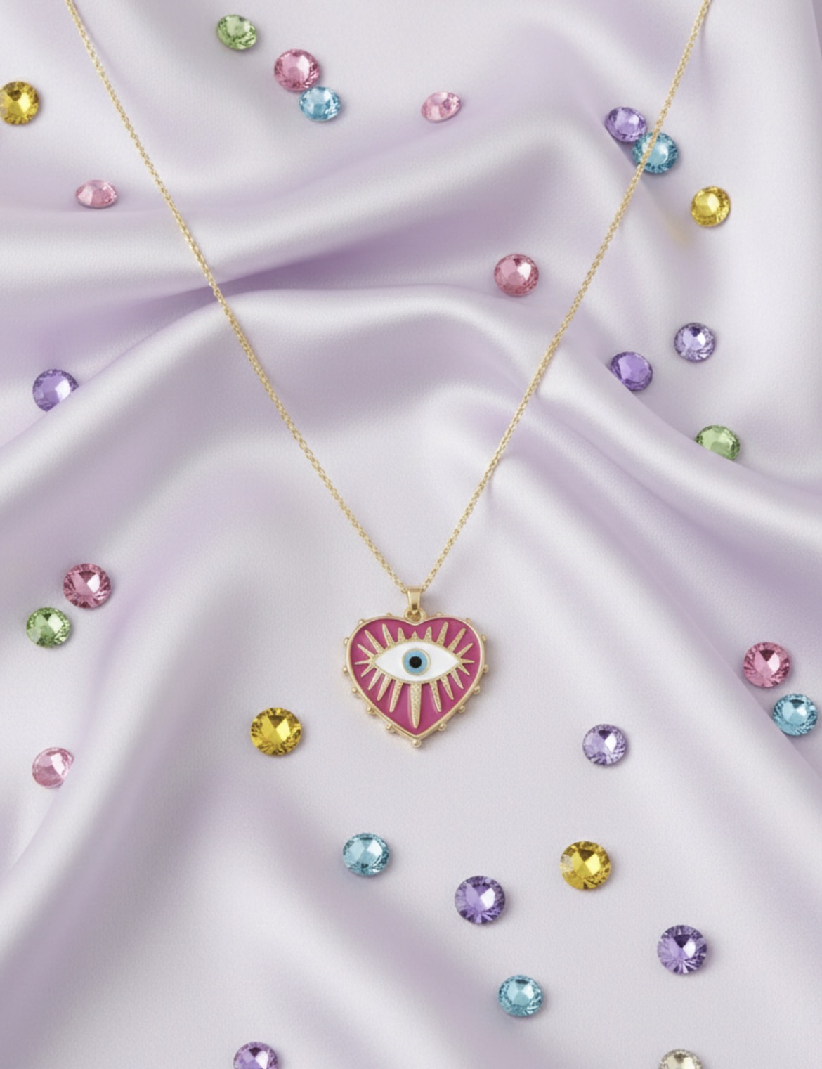 Al centro di ogni pezzo batte un cuore in oro, custode di uno sguardo attento e luminoso. L’occhio, simbolo universale di protezione e intuizione, è realizzato con smalti vibranti e circondato da una raggiera dorata che ne amplifica la luce.
