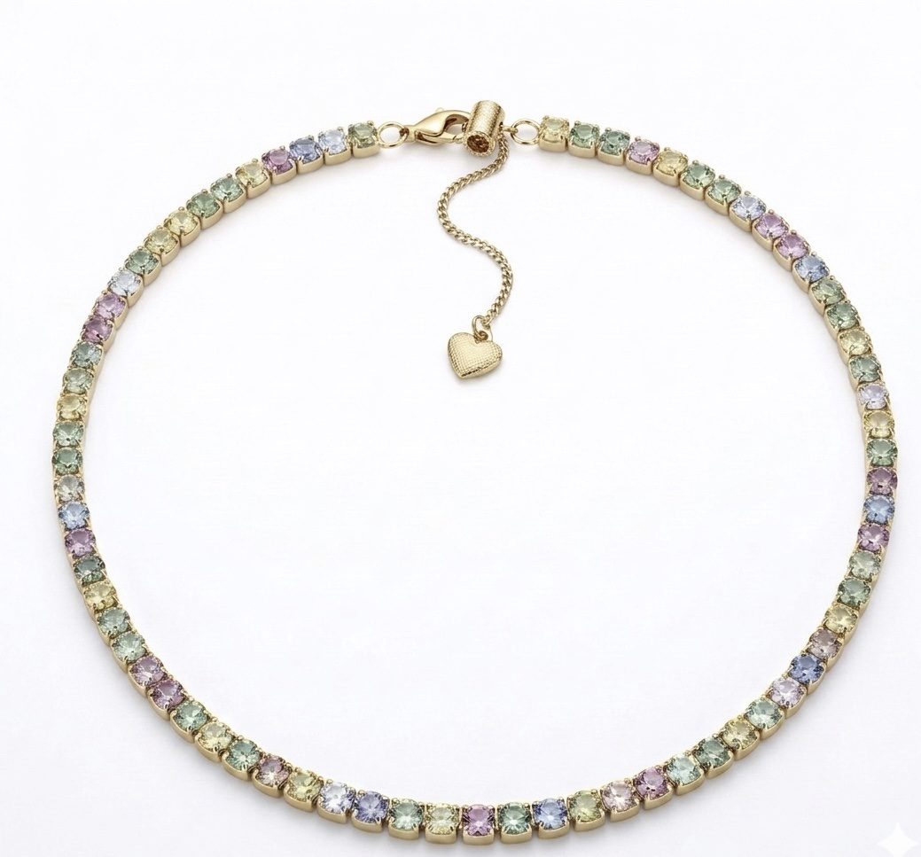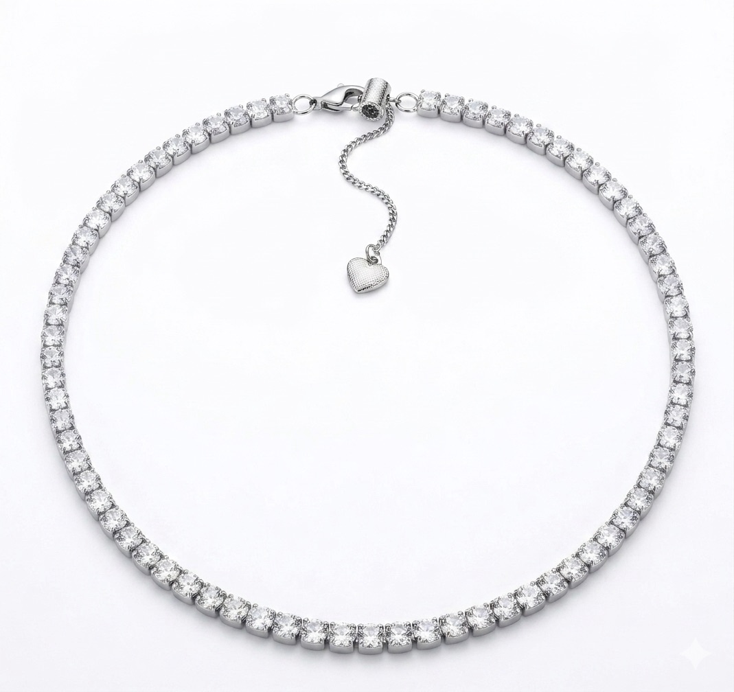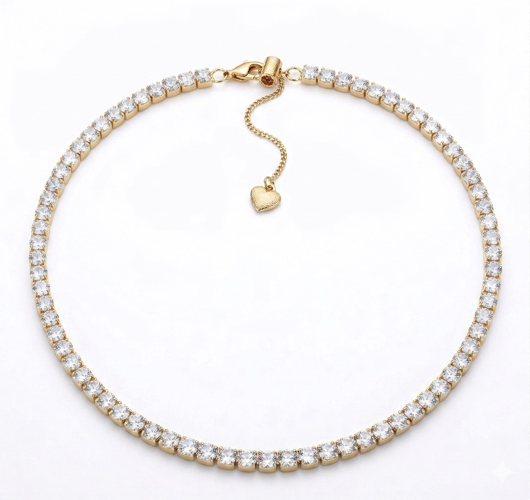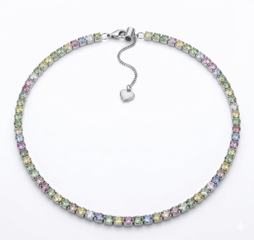 Realizzato in acciaio inox di alta qualità, è progettato per durare nel tempo senza perdere brillantezza. La fila continua di strass scintillanti crea un effetto luce uniforme e sofisticato, perfetto per illuminare il décolleté in ogni occasione.