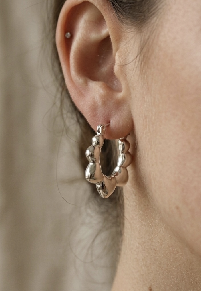 Dimentica i soliti cerchi. Gli orecchini Frisé reinterpretano il design classico con un tocco audace e ultra-moderno. Caratterizzati da una silhouette “mossa” che alterna volumi bombati a forma di cuore, questi orecchini creano un gioco di riflessi dinamico che illumina istantaneamente il volto.
